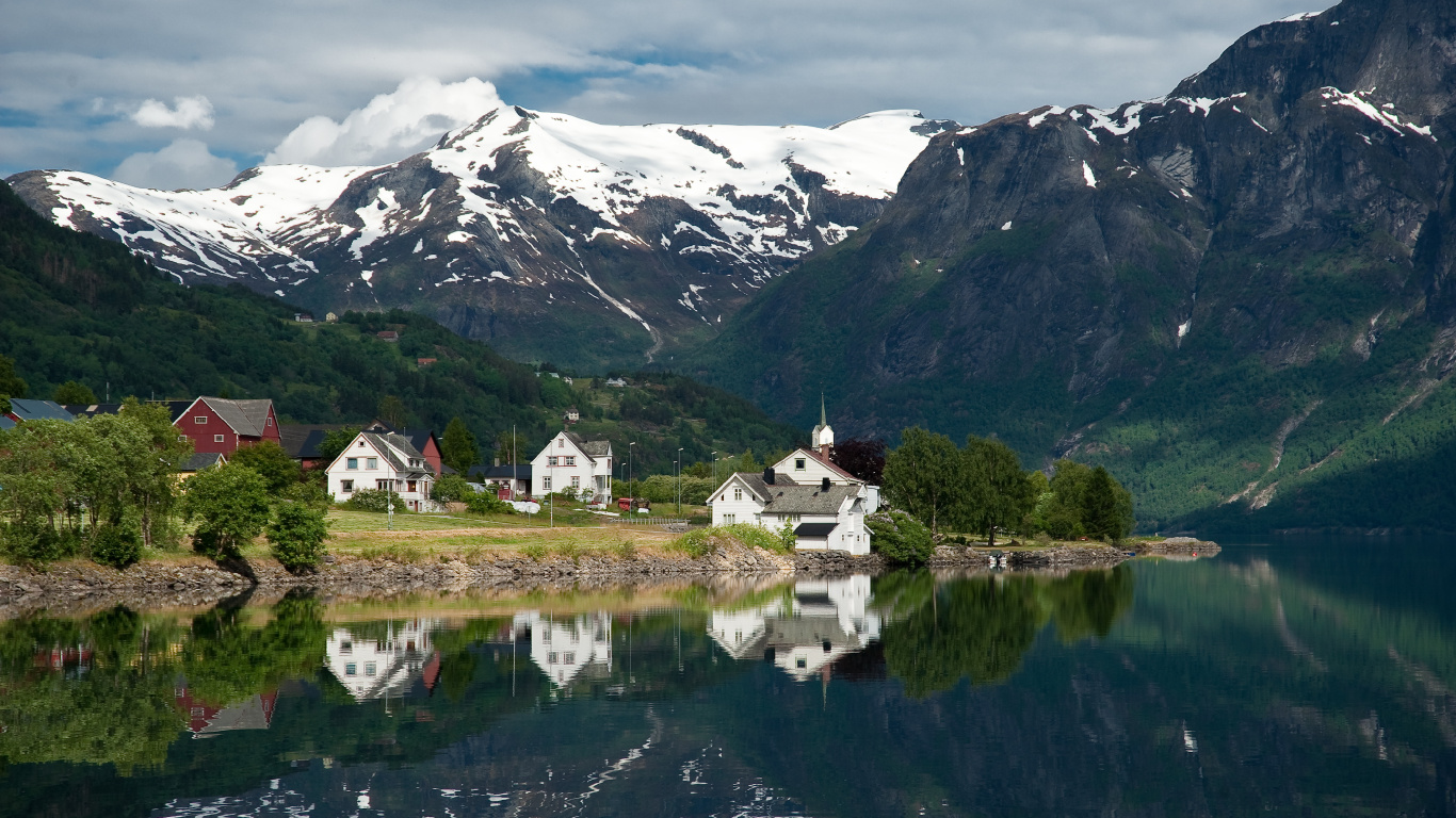 Hintergrundbilder 1366x768 Weißes Haus in Der Nähe Von See Und Bergen, Laptop Bilder