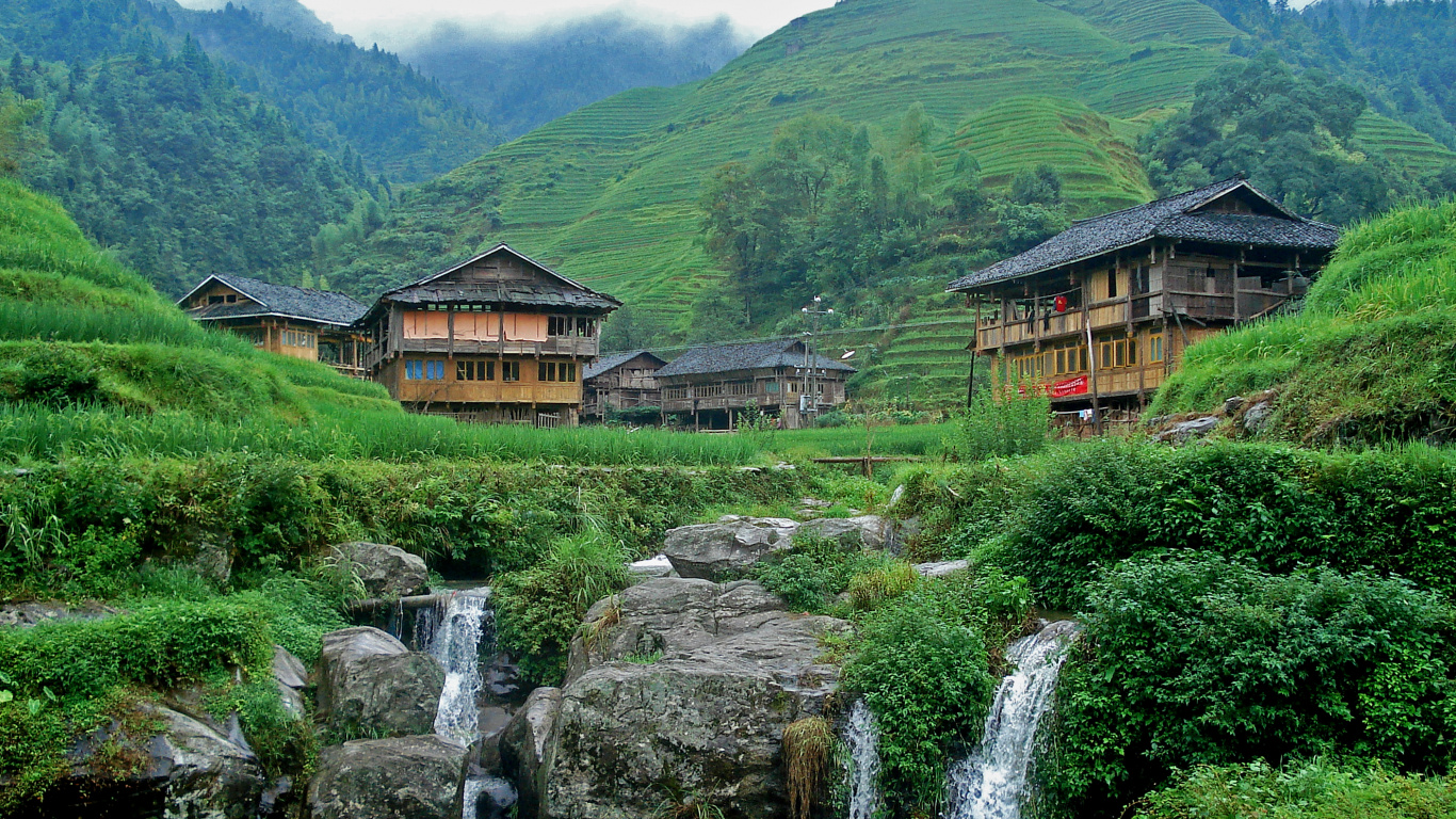 Hintergrundbilder 1366x768 Braunes Holzhaus in Der Nähe Von Wasserfällen Tagsüber, Laptop Bilder