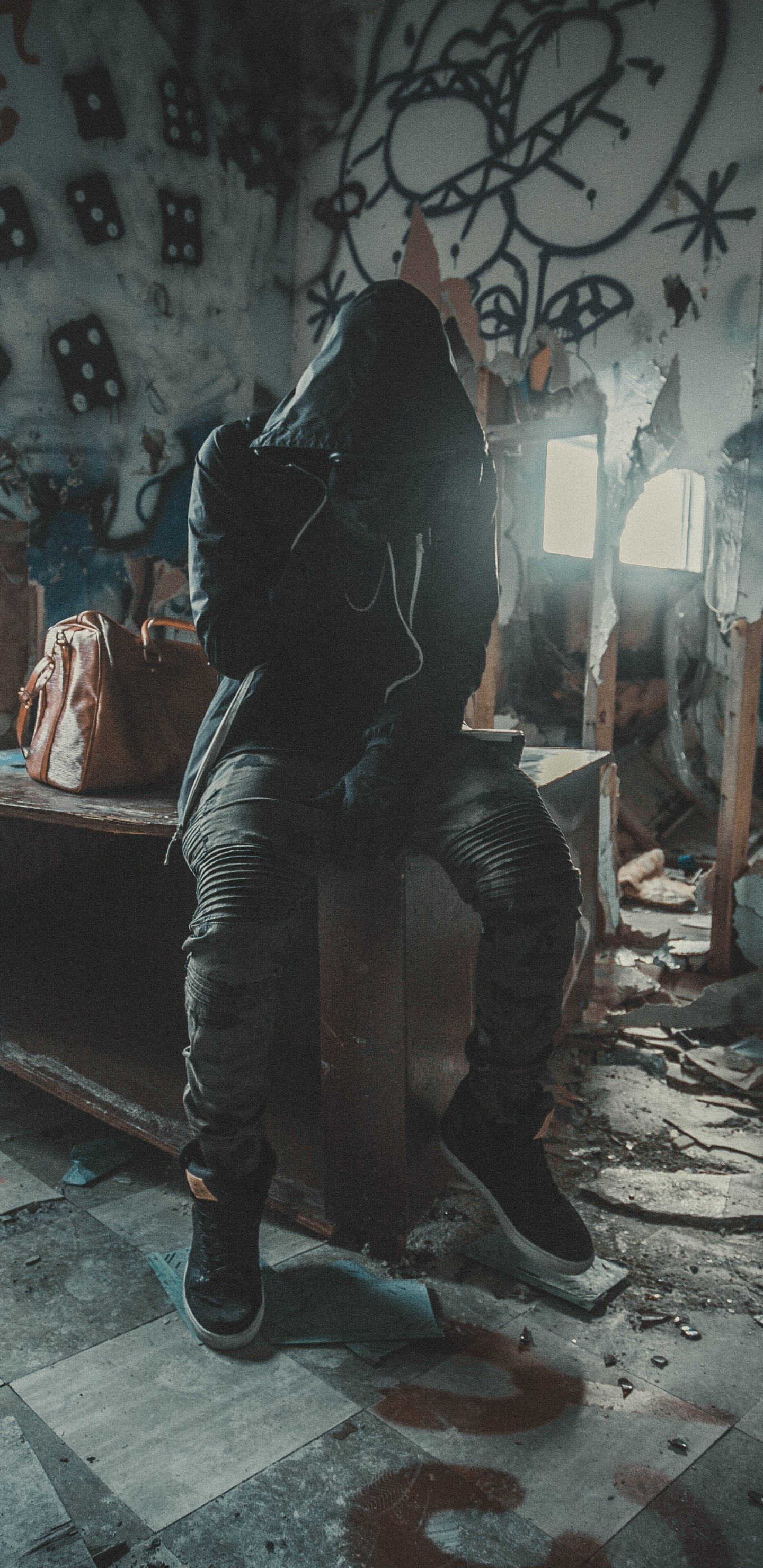 Hintergrundbilder 1440x2960 Mann in Schwarzer Jacke Sitzt Auf Brauner Holzbank, Samsung Galaxy S8/S8+/S9/S9+/Note 8/Note 9 QHD Bilder