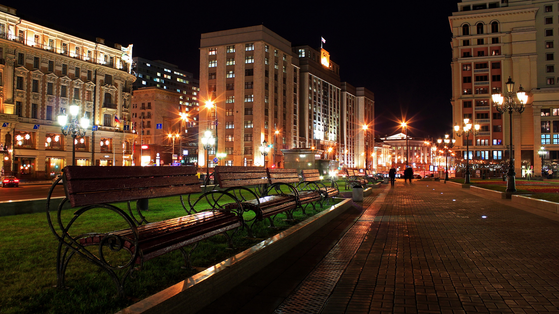 Hintergrundbilder 1920x1080 Leute, Die Nachts Auf Dem Bürgersteig in Der Nähe Eines Braunen Betongebäudes Gehen, Full HD, HDTV, 1080p 16:9 Bilder
