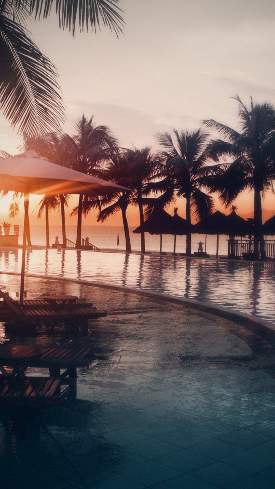 Hintergrundbilder 1080x1920 Braune Strandliegen Aus Holz in Strandnähe Bei Sonnenuntergang, Android Phone Sony Xperia XA2/X/Z, Samsung Galaxy S4/S5/J7/A5, Meizu M5/M6 Note, Xiaomi Redmi Note 3 Full HD Bilder