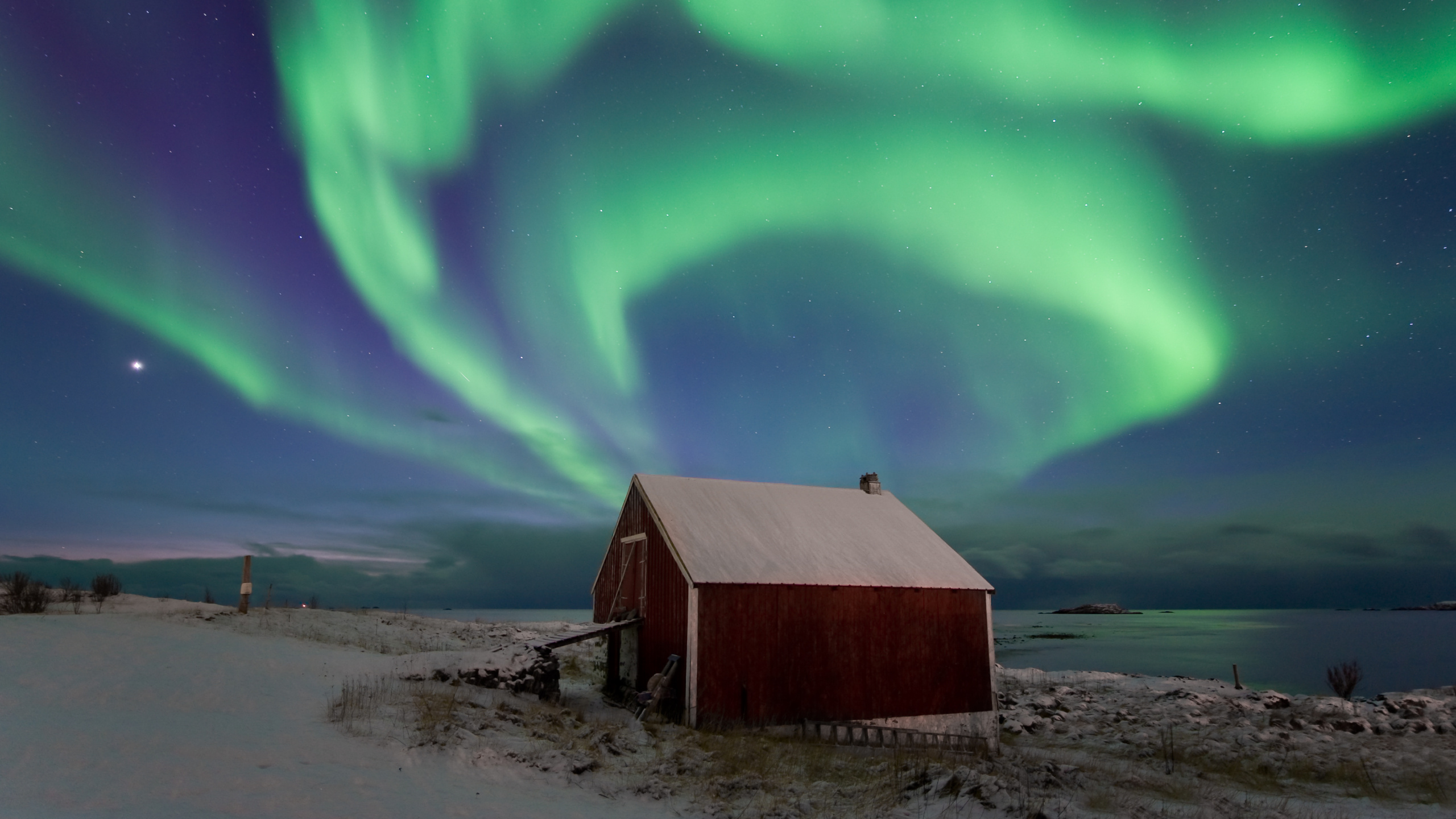 Fondos 2560x1440 Granero de Madera Marrón Bajo un Cielo Verde, WQHD, QHD, 16:9 Imágenes