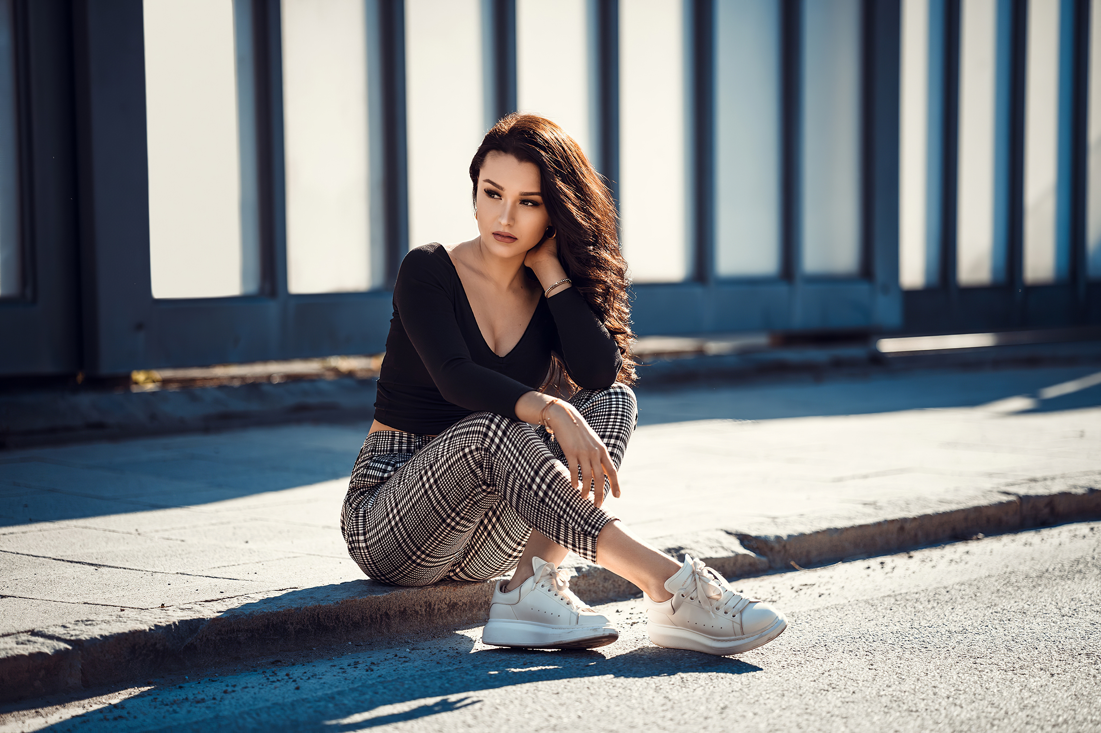 Fondos Mujer en Camisa de Manga Larga Negra y Falda a Rayas en Blanco y Negro Sentado en el Piso de Concreto de Pantalla e Imágenes