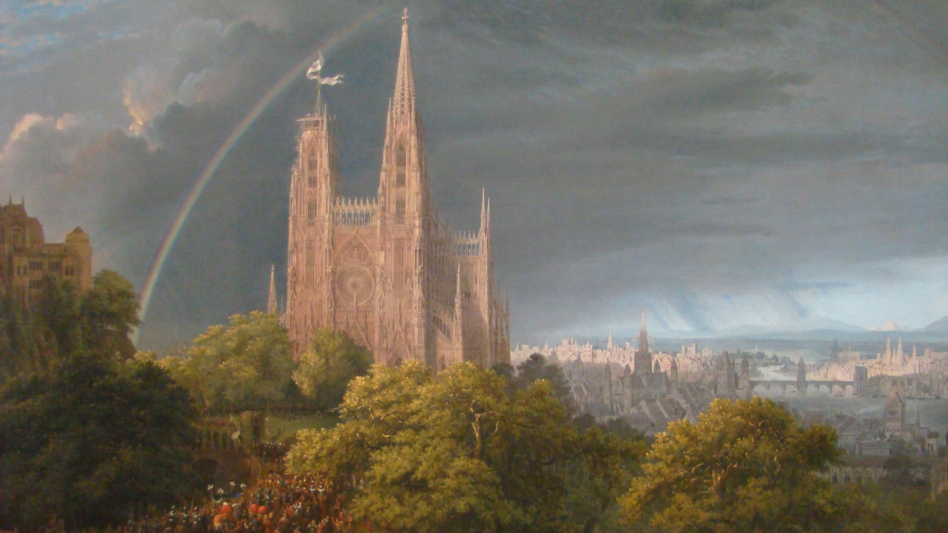 Fondos 1920x1080 Árboles Marrones y Verdes Cerca Del Castillo Bajo Nubes Blancas, Full HD, HDTV, 1080p 16:9 Imágenes