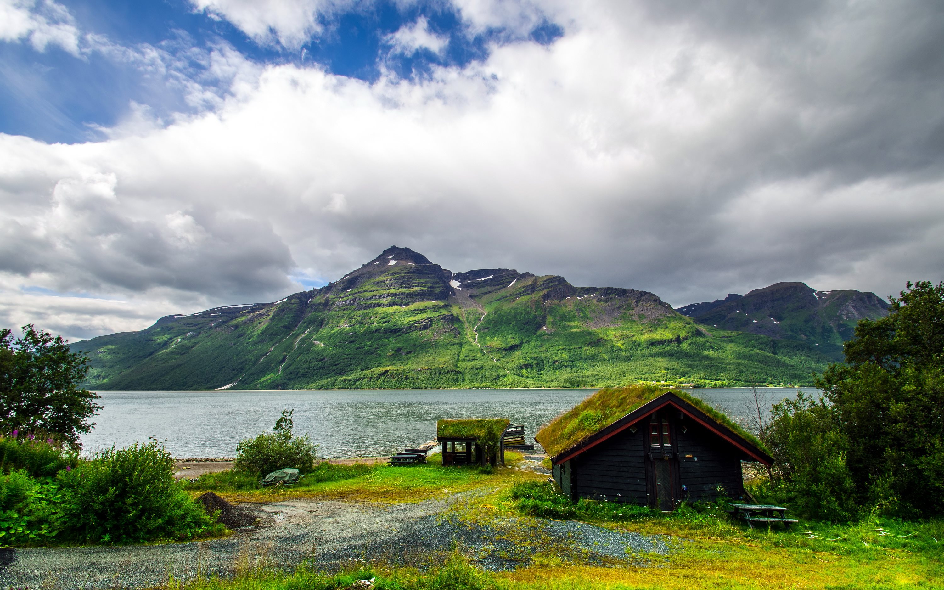 Les Fonds D’écran Maison en Bois Brune Sur le Terrain D'herbe Verte Près du Lac Sous Les Nuages Blancs et le Ciel Bleu Pendant et Les Images