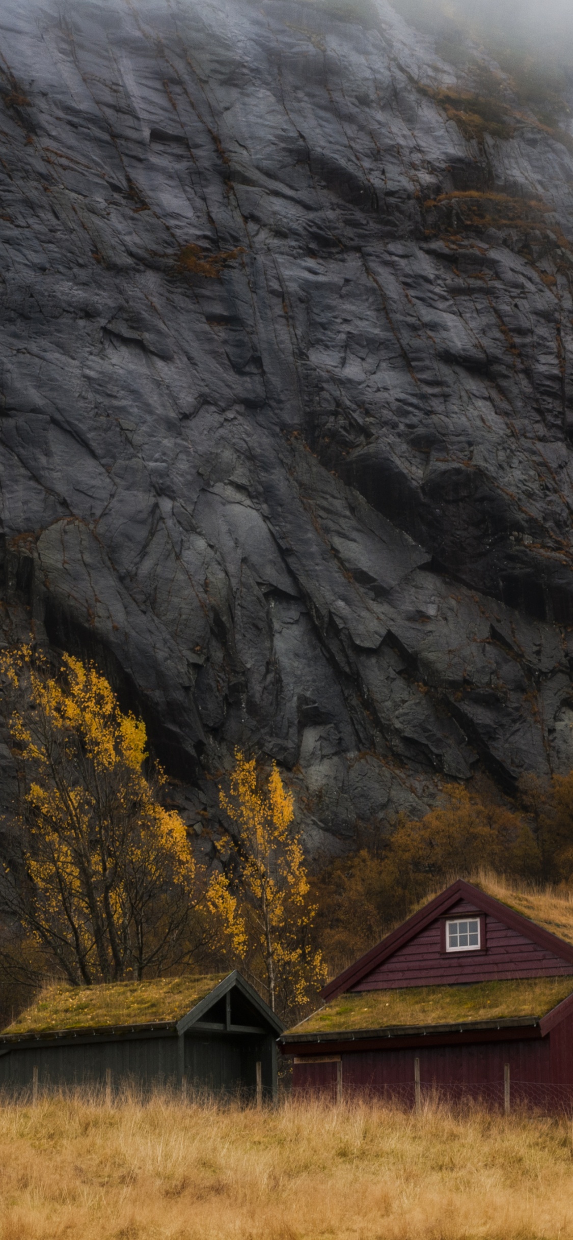 1125x2436 Brown Wooden House Near Gray Mountain Wallpaper for IPhone X / XS