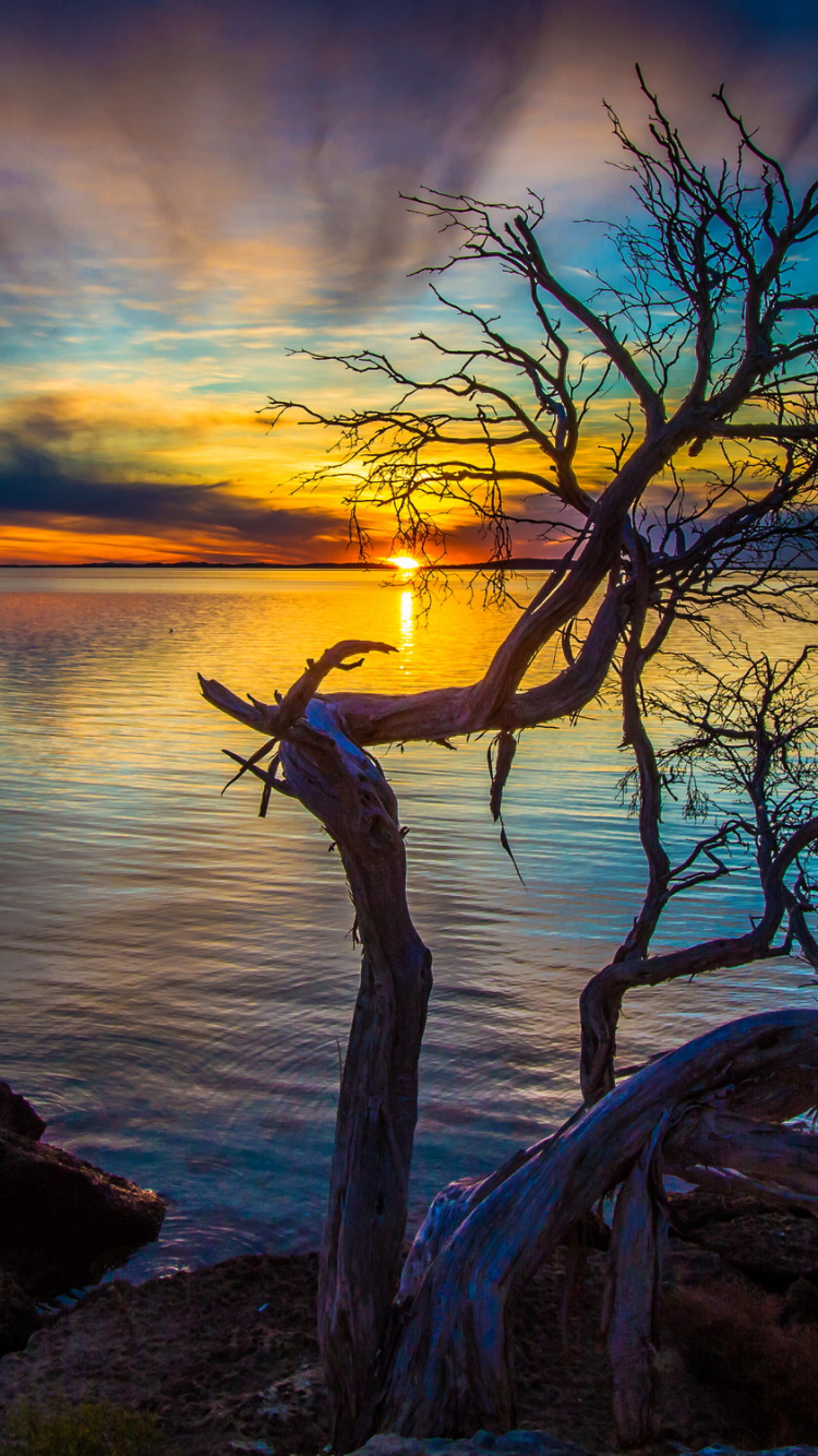 750x1334 Bare Tree Near Body of Water During Sunset Wallpaper for IPhone 6, 6S, 7, 8