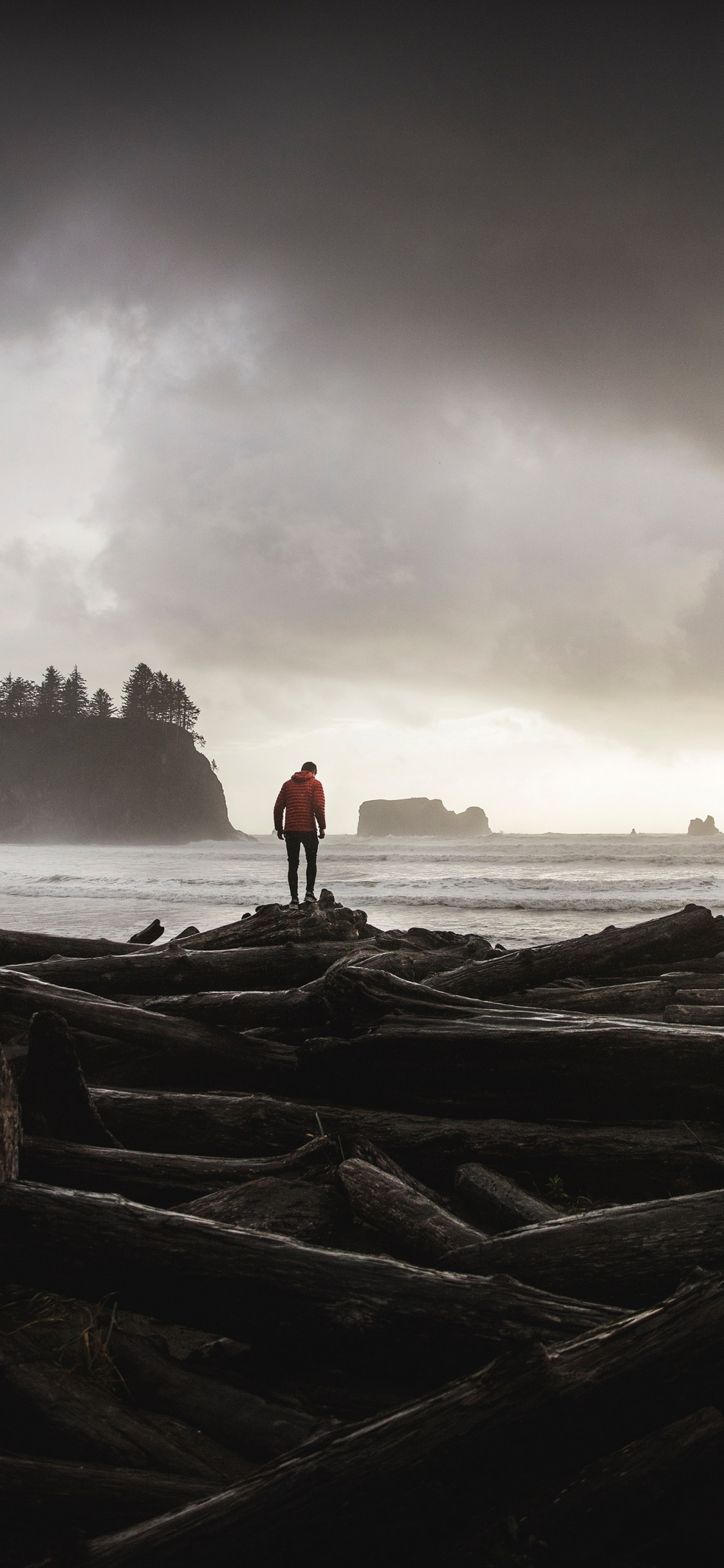 1125x2436 Man in Red Jacket Standing on Brown Rock Formation Near Body of Water During Daytime Wallpaper for IPhone X / XS
